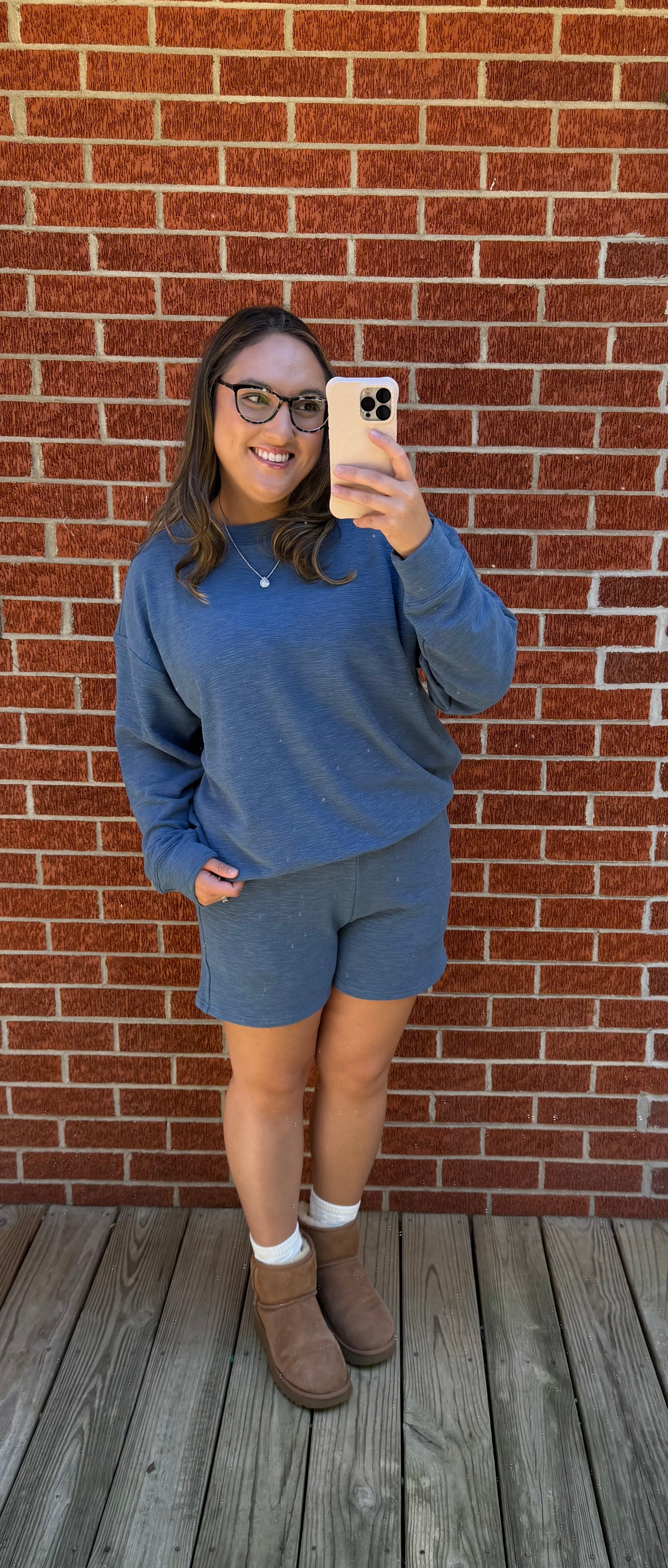 The set includes a relaxed pullover top and easy-fitting shorts, both in a rich, warm Dusty Blue color that is both flattering and versatile. Best of all, the shorts feature convenient pockets, making this outfit as practical as it is comfortable.